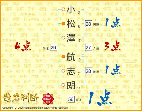 小(3画)松(8画)澤(17画) 航(10画)志(7画)朗(11画)