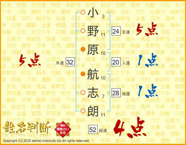小(3画)野(11画)原(10画) 航(10画)志(7画)朗(11画)