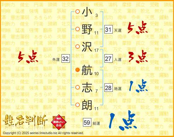 小(3画)野(11画)沢(17画) 航(10画)志(7画)朗(11画)