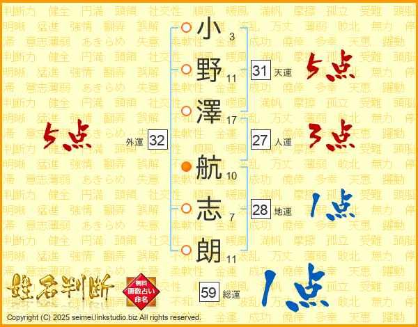 小(3画)野(11画)澤(17画) 航(10画)志(7画)朗(11画)