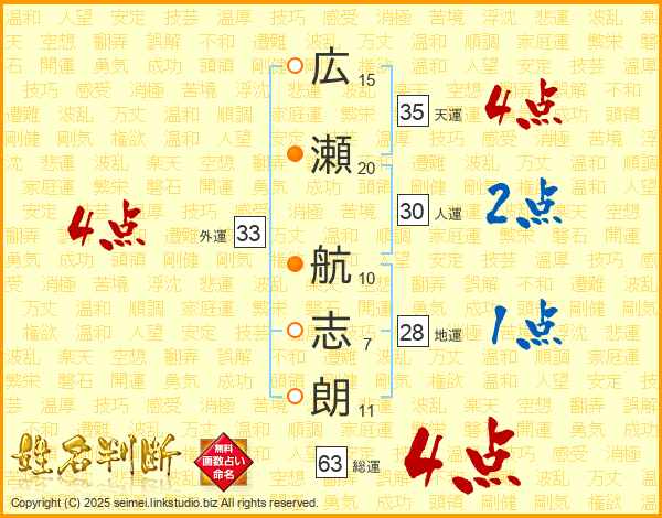 広(15画)瀬(20画) 航(10画)志(7画)朗(11画)