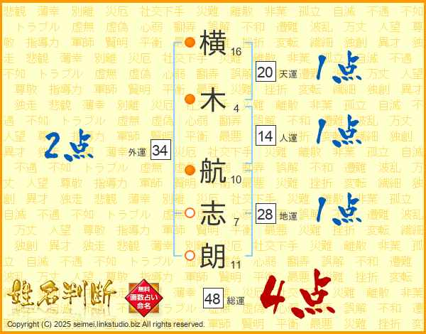 横(16画)木(4画) 航(10画)志(7画)朗(11画)