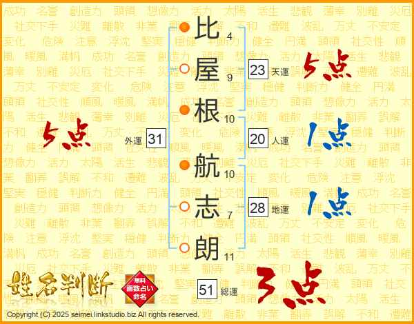 比(4画)屋(9画)根(10画) 航(10画)志(7画)朗(11画)