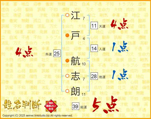 江(7画)戸(4画) 航(10画)志(7画)朗(11画)
