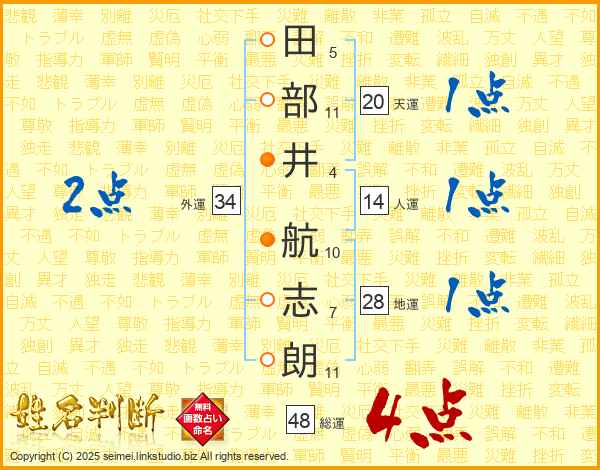 田(5画)部(11画)井(4画) 航(10画)志(7画)朗(11画)
