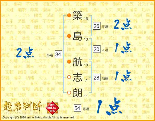 築(16画)島(10画) 航(10画)志(7画)朗(11画)
