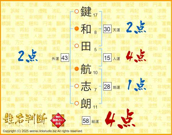 鍵(17画)和(8画)田(5画) 航(10画)志(7画)朗(11画)