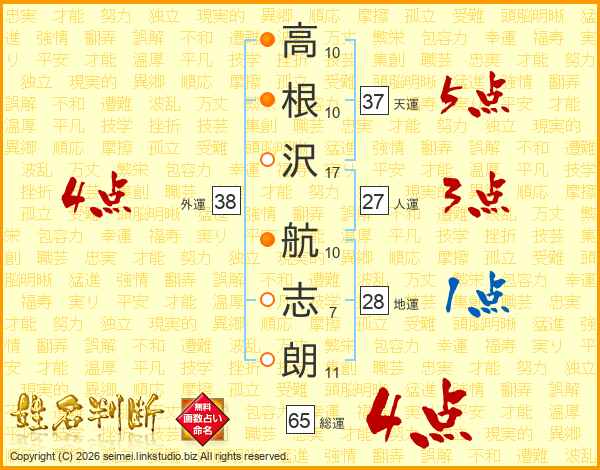 高(10画)根(10画)沢(17画) 航(10画)志(7画)朗(11画)