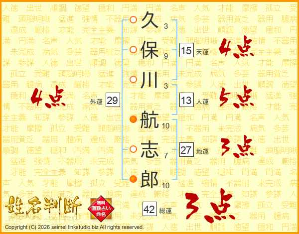 久(3画)保(9画)川(3画) 航(10画)志(7画)郎(10画)