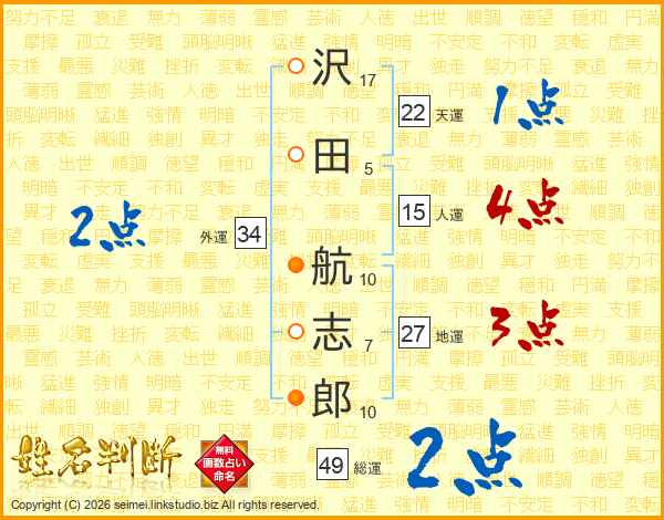 沢(17画)田(5画) 航(10画)志(7画)郎(10画)