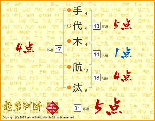 手(4画)代(5画)木(4画) 航(10画)汰(8画)