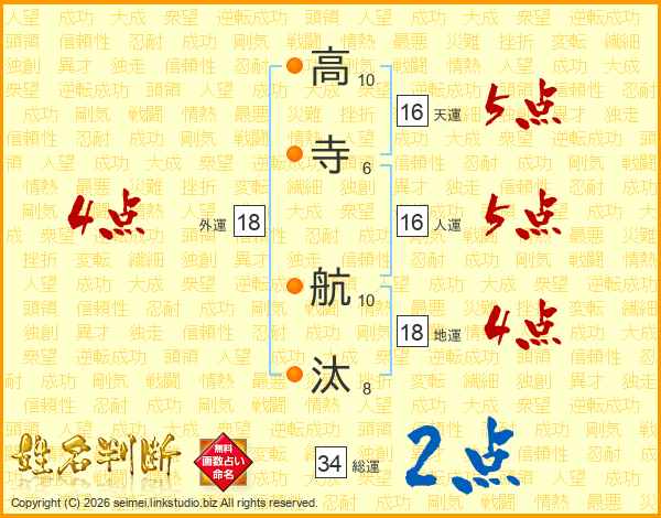 高(10画)寺(6画) 航(10画)汰(8画)