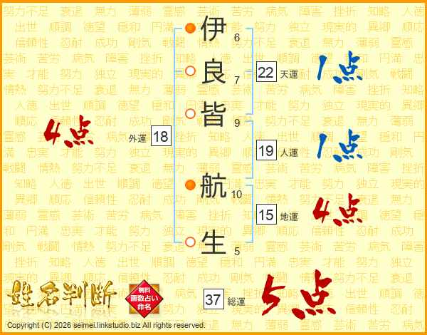 伊(6画)良(7画)皆(9画) 航(10画)生(5画)