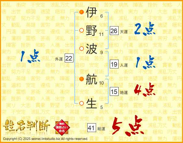 伊(6画)野(11画)波(9画) 航(10画)生(5画)