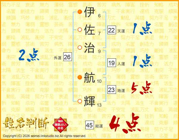伊(6画)佐(7画)治(9画) 航(10画)輝(13画)