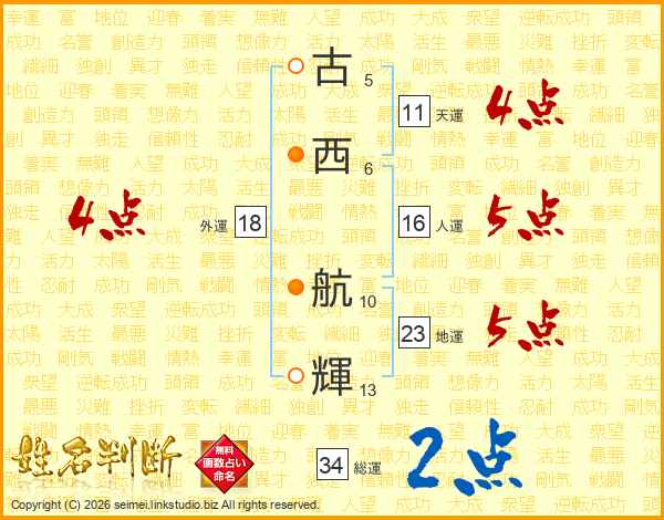 あなたの人生を表す1番重要な運勢です。生涯を通じて影響する総合運となり、主に50歳以降の晩年期に影響を及ぼします。苗字と名前の合計画数。