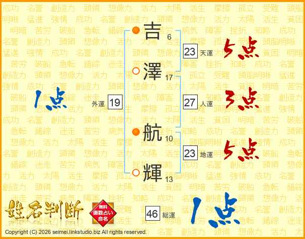 吉(6画)澤(17画) 航(10画)輝(13画)