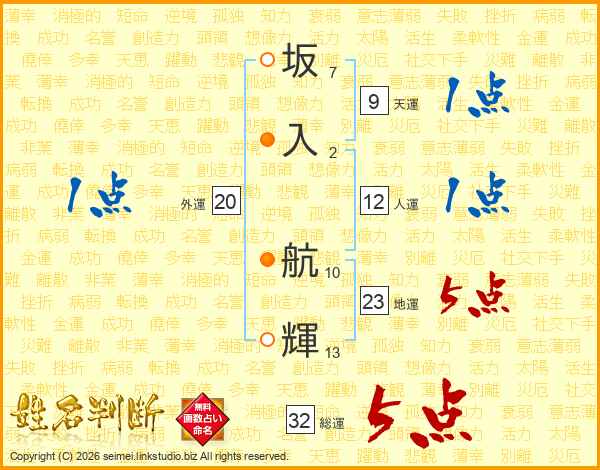 生活面を象徴する運勢です。外部から受ける影響力を表し、結婚運、家庭運や職場、環境への順応性を表します。総運から人運を引いた画数。姓や名が1文字の場合を除く。