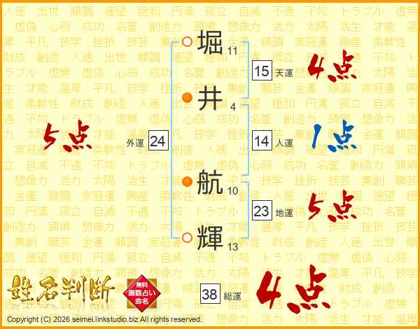 堀(11画)井(4画) 航(10画)輝(13画)