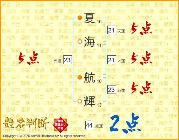 あなたの人生を表す1番重要な運勢です。生涯を通じて影響する総合運となり、主に50歳以降の晩年期に影響を及ぼします。苗字と名前の合計画数。