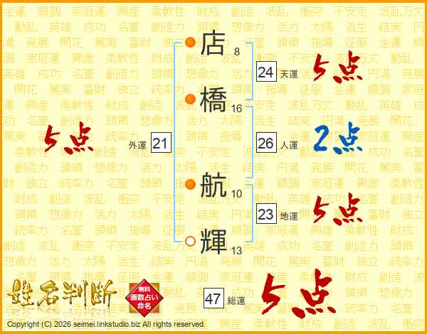 店(8画)橋(16画) 航(10画)輝(13画)
