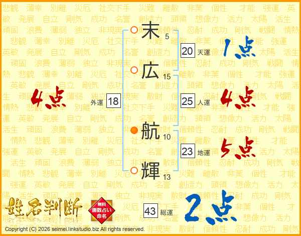 生活面を象徴する運勢です。外部から受ける影響力を表し、結婚運、家庭運や職場、環境への順応性を表します。総運から人運を引いた画数。姓や名が1文字の場合を除く。
