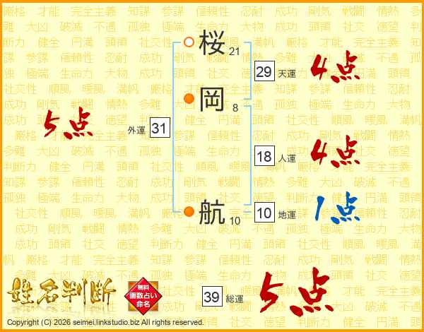 生活面を象徴する運勢です。外部から受ける影響力を表し、結婚運、家庭運や職場、環境への順応性を表します。総運から人運を引いた画数。姓や名が1文字の場合を除く。