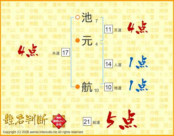 生活面を象徴する運勢です。外部から受ける影響力を表し、結婚運、家庭運や職場、環境への順応性を表します。総運から人運を引いた画数。姓や名が1文字の場合を除く。