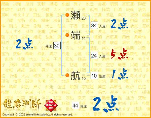 瀬端航さんの人運は24画の5点!
