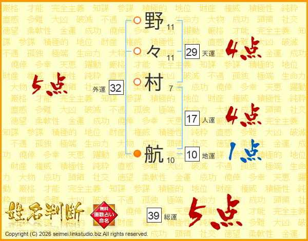野々村航さんの総運は39画の5点!