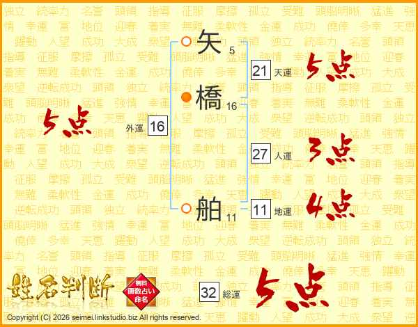 矢橋舶さんの総運は32画の5点!