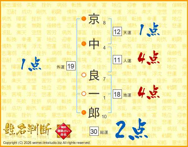京(8画)中(4画) 良(7画)一(1画)郎(10画)