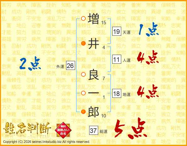 増(15画)井(4画) 良(7画)一(1画)郎(10画)