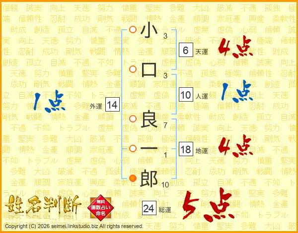 小(3画)口(3画) 良(7画)一(1画)郎(10画)