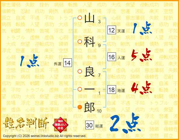 山(3画)科(9画) 良(7画)一(1画)郎(10画)