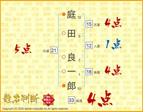 庭(10画)田(5画) 良(7画)一(1画)郎(10画)