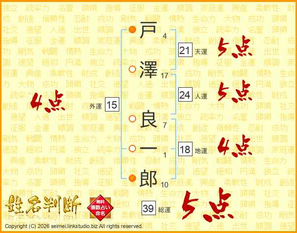 戸(4画)澤(17画) 良(7画)一(1画)郎(10画)