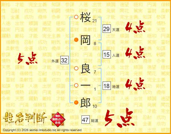 桜(21画)岡(8画) 良(7画)一(1画)郎(10画)