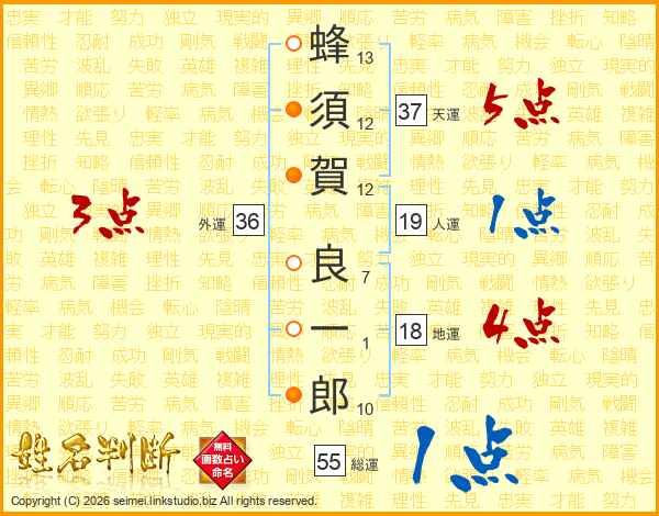 蜂(13画)須(12画)賀(12画) 良(7画)一(1画)郎(10画)