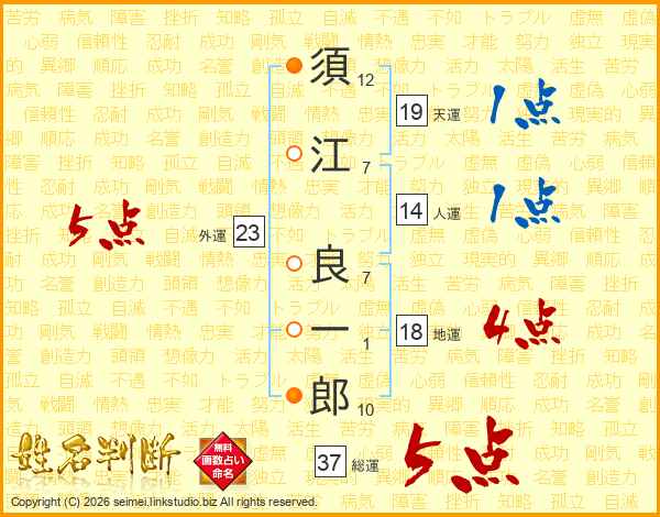 須(12画)江(7画) 良(7画)一(1画)郎(10画)