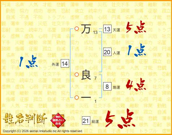 生活面を象徴する運勢です。外部から受ける影響力を表し、結婚運、家庭運や職場、環境への順応性を表します。総運から人運を引いた画数。姓や名が1文字の場合を除く。