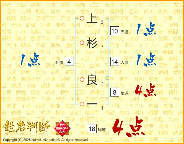生活面を象徴する運勢です。外部から受ける影響力を表し、結婚運、家庭運や職場、環境への順応性を表します。総運から人運を引いた画数。姓や名が1文字の場合を除く。
