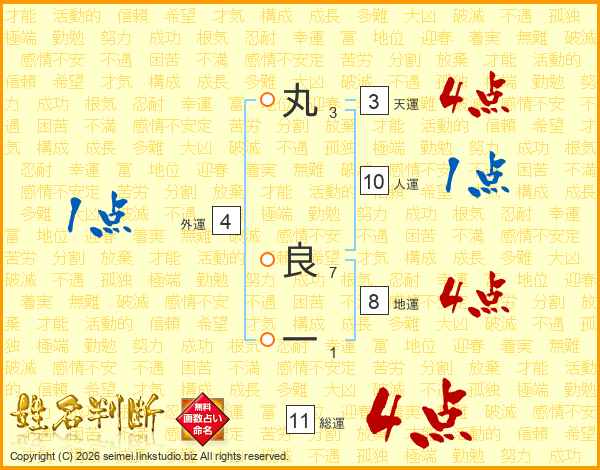 生活面を象徴する運勢です。外部から受ける影響力を表し、結婚運、家庭運や職場、環境への順応性を表します。総運から人運を引いた画数。姓や名が1文字の場合を除く。