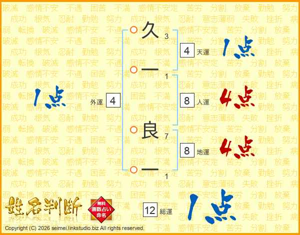 生活面を象徴する運勢です。外部から受ける影響力を表し、結婚運、家庭運や職場、環境への順応性を表します。総運から人運を引いた画数。姓や名が1文字の場合を除く。
