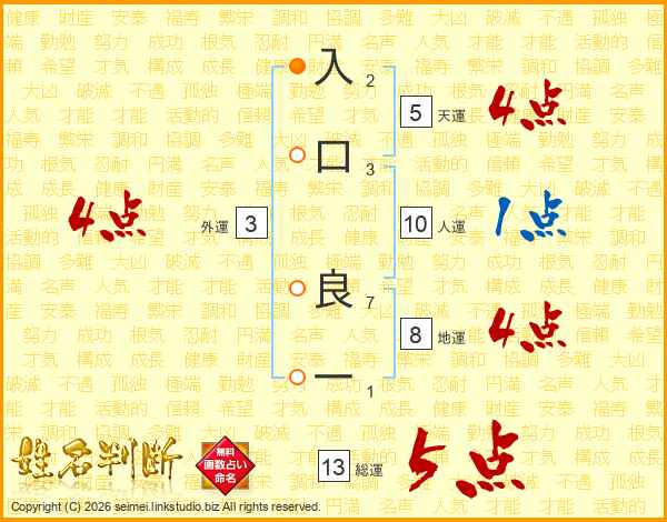 生活面を象徴する運勢です。外部から受ける影響力を表し、結婚運、家庭運や職場、環境への順応性を表します。総運から人運を引いた画数。姓や名が1文字の場合を除く。