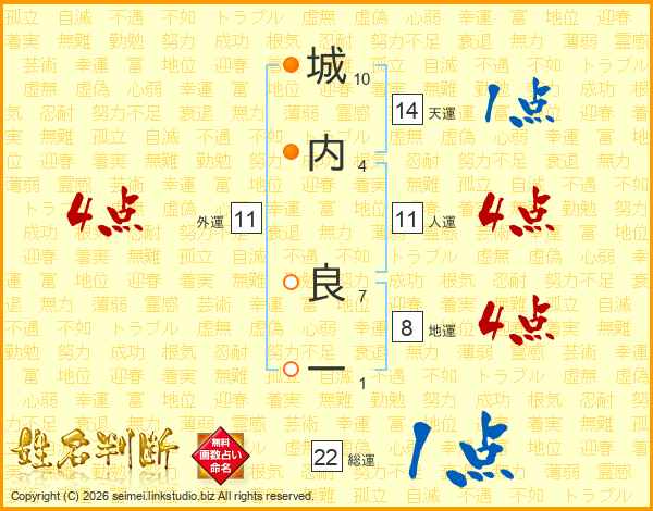 生活面を象徴する運勢です。外部から受ける影響力を表し、結婚運、家庭運や職場、環境への順応性を表します。総運から人運を引いた画数。姓や名が1文字の場合を除く。