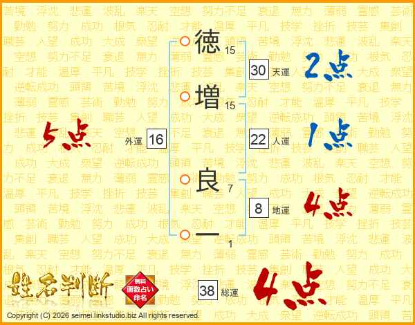 徳(15画)増(15画) 良(7画)一(1画)