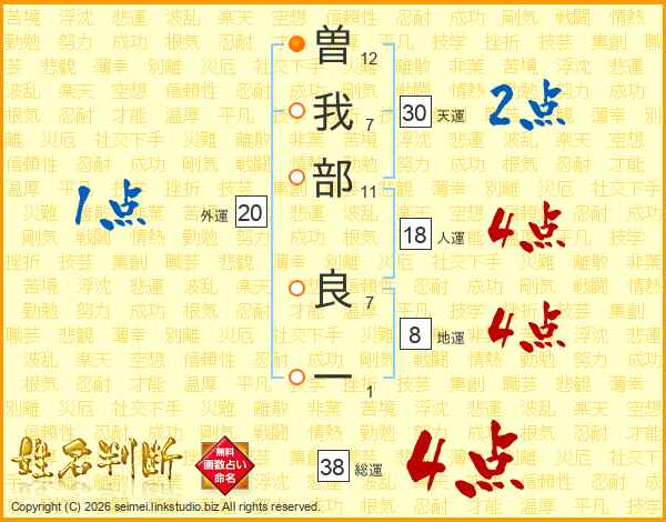 曽(12画)我(7画)部(11画) 良(7画)一(1画)