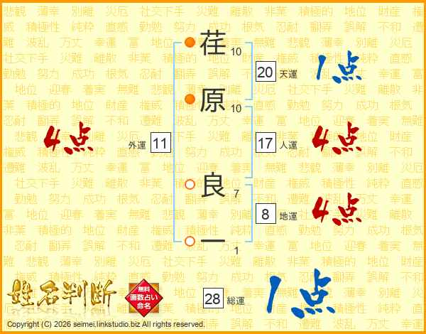 生活面を象徴する運勢です。外部から受ける影響力を表し、結婚運、家庭運や職場、環境への順応性を表します。総運から人運を引いた画数。姓や名が1文字の場合を除く。