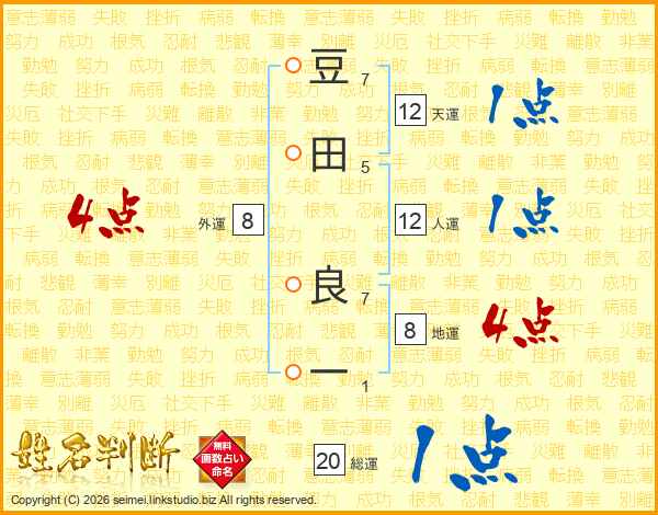 生活面を象徴する運勢です。外部から受ける影響力を表し、結婚運、家庭運や職場、環境への順応性を表します。総運から人運を引いた画数。姓や名が1文字の場合を除く。